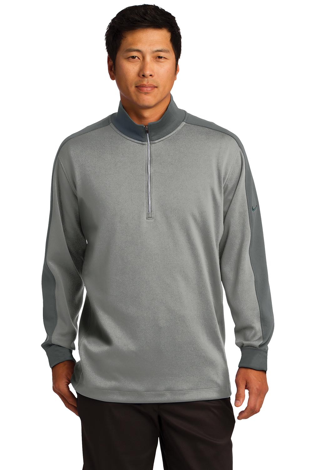 A boldly striped inner collar and reverse coil zipper give this cover-up an edge. Of course, it also performs with Dri-FIT moisture management technology. The design features a flat knit collar and cuffs and an open hem. The contrast Swoosh design trademark is embroidered on the upper left sleeve. Made of 8.3-ounce, 100% Dri-FIT polyester.