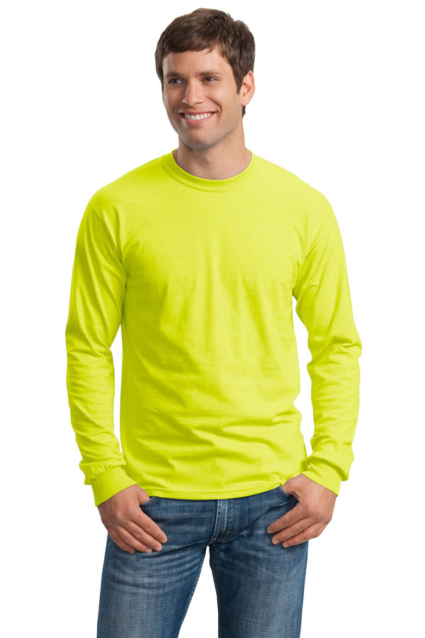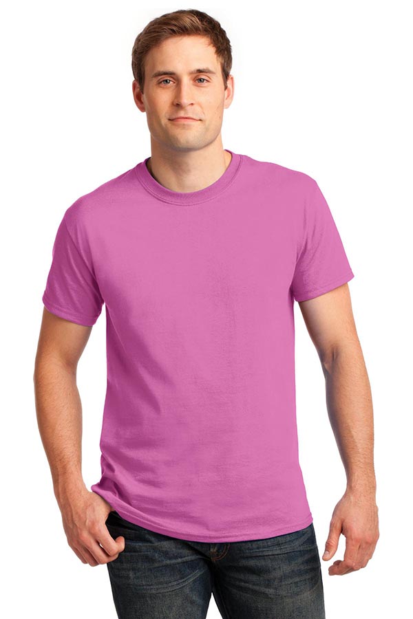 - 50/50 cotton/poly (Dark Heather, Safety Green, Safety Pink)